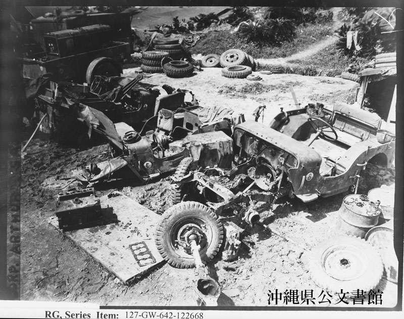 | 34 | | | 分 類 名: | 米国海兵隊 | | 撮 影 地: | | | 撮 影 日: | 1945年 5月 | | アルバム名: | 米海兵隊写真資料29 | | 写真解説: | 【原文】 Not only does the Sixth Tank Battalion lose tanks but also other vehicles. Three jeeps were knocked out in the Naha area, some had direct 47mm anti-tank cannon hits. 【和訳】 第6戦車大隊は戦車のみならず他の車両も失った。那覇ではジープ3台が破壊され、47ミリ対戦車カノン砲の直撃弾を受けたものもあった。 | |