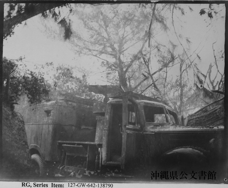 | 53 | | | 分 類 名: | 米国海兵隊 | | 撮 影 地: | | | 撮 影 日: | 1945年 5月30日 | | アルバム名: | 米海兵隊写真資料29 | | 写真解説: | 【原文】 COMMAND CAR: PhM3/C Jack R. Swank, San Diego, Calif., looks over Jap command car found amid the ruins of Shuri Castle. The castle was taken by 1stDiv Marines of the 5thReg. LtCol Charles W. Shelburne, Kerrville, Texas. 【和訳】 日本軍司令車。廃墟と化した首里城の真ん中で発見された日本軍司令車を調べるスワンク衛生兵。首里城は、テキサス州出身のシェルバーン中佐率いる第1海兵師団第5連隊によって攻略された。 | |