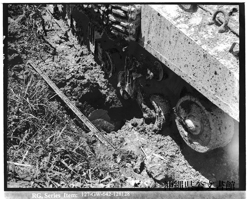| 66 | | | 分 類 名: | 米国海兵隊 | | 撮 影 地: | 伊平屋島 | | 撮 影 日: | 1945年 6月 8日 | | アルバム名: | 米海兵隊写真資料29 | | 写真解説: | 【原文】 Tanks attempting to negotiate soft valley roads, bog leapelessly [sic]. Three of these stalled in rice paddies during infantry advance on D plus one day. 【和訳】 くぼ地のぬかるんだ泥道を通り抜けようと奮闘したが、立ち往生する戦車。そのうちの3台は上陸2日目、歩兵隊が進軍する間に田んぼに落ちた。 | |
