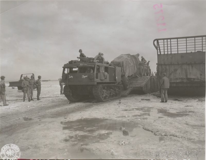 | 10 | | | 分 類 名: | 米国陸軍通信隊 沖縄関係 | | 撮 影 地: | 慶伊瀬島 | | 撮 影 日: | 1945年3月31日 | | アルバム名: | 米陸軍通信隊写真 13 | | 写真解説: | 【原文】A prime mover and a Long Tom are moving off the pontoon dock onto the beach. These guns were set up on this small island, near Okinawa, and were ready to fire by morning just before our troops moved ashore. F.A. Group. / 【和訳】浮桟橋から浜辺に移動する155mmカノン砲(ロングトム)と戦車(プライムムーバー)。沖縄に近いこの小さな島に設置され、上陸直前の朝までには発射可能となった。野戦砲兵隊。 | |