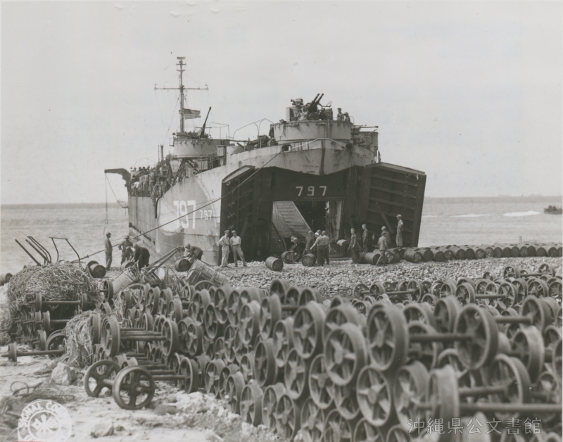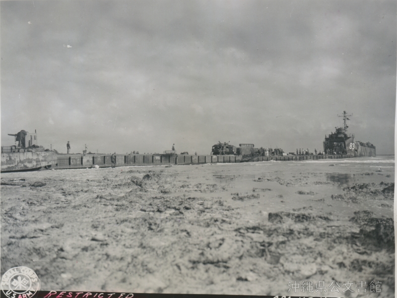 | 17 | | | 分 類 名: | 米国陸軍通信隊 沖縄関係 | | 撮 影 地: | 伊江島 | | 撮 影 日: | 1945年4月19日 | | アルバム名: | 米陸軍通信隊写真 13 | | 写真解説: | 【原文】Unloading drums of oil from LST on beach of Ie Shima. A channel through the coral reef was blasted to permit the PST to approach the beach. / 【和訳】伊江島の海岸で戦車揚陸艦からオイルのドラム缶を降ろす。サンゴ礁を爆破して出来た水路によりプロペラ式短距離離着陸輸送機が海岸に接近できるようになった。 | |