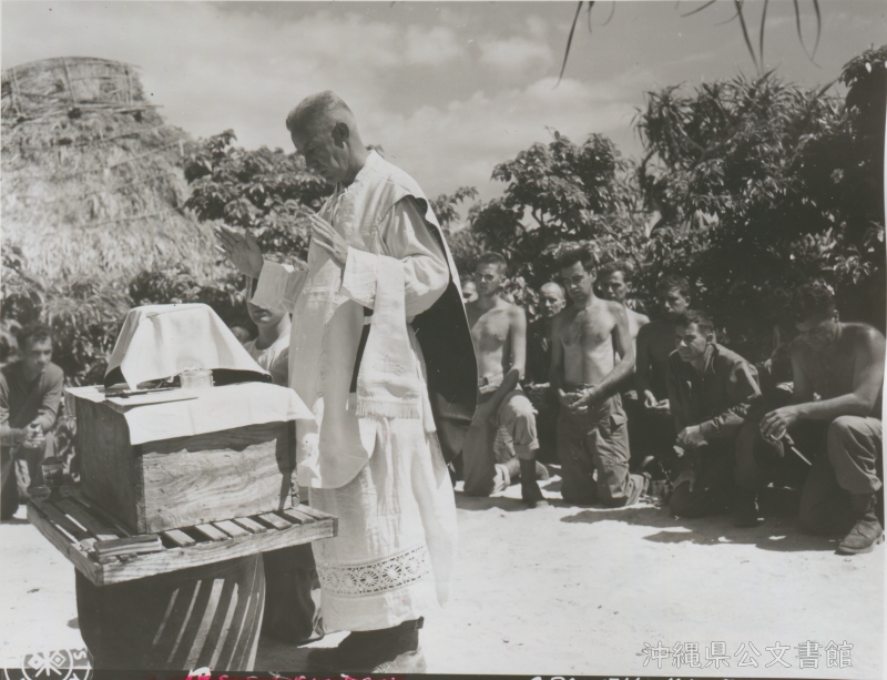 | 12 | | | 分 類 名: | 米国陸軍通信隊 沖縄関係 | | 撮 影 地: | [水納島] | | 撮 影 日: | 1945年4月14日 | | アルバム名: | 米陸軍通信隊写真 13 | | 写真解説: | 【原文】Chaplain Joseph N Pohl, St. Louis, MO conducts catholic services on the island of Mimi Shima, just prior to the start of artillery bombardment of Ie Shima, which preceded successful landings there. Artillerymen of the 77th Div. bow there heads in prayer before wanning their guns. / 【和訳】伊江島への上陸に先立ち砲撃開始を前に、[水納] 島でカトリックの礼拝を行なうミズーリ州セントルイスのジョセフ・N・ポール神父。戦闘前に頭を下げて祈る第77師団兵士たち。 | |