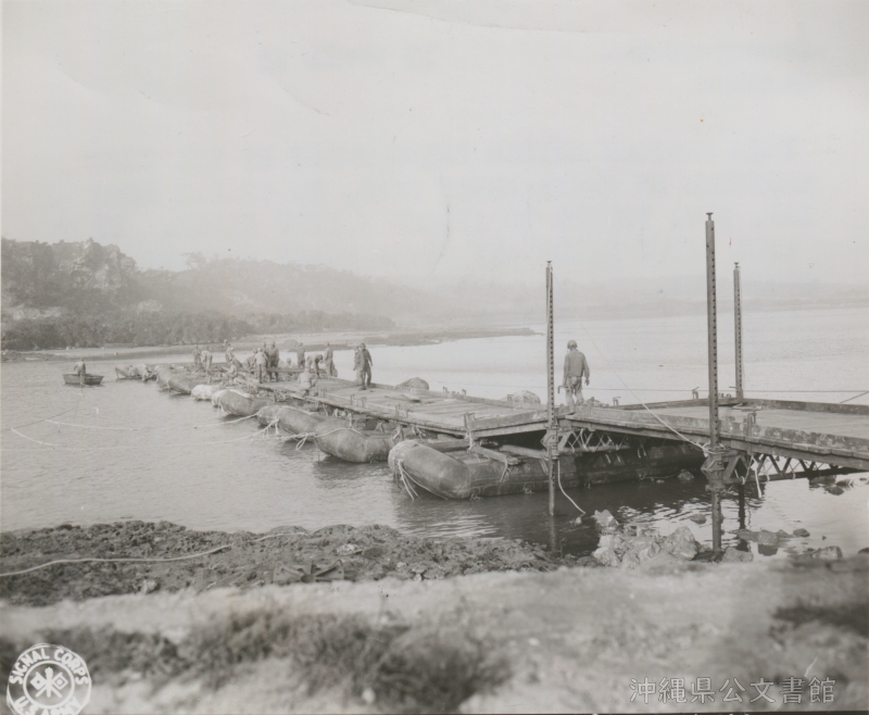 | 16 | | | 分 類 名: | 米国陸軍通信隊 沖縄関係 | | 撮 影 地: | 沖縄 | | 撮 影 日: | 1945年4月19日 | | アルバム名: | 米陸軍通信隊写真 13 | | 写真解説: | 【原文】This pontoon bridge being built by the Engineer Bn under enemy fire, to enable 27th Inf. Div. troops to attack Kakazu Ridge. It will carry tanks and other heavy mechanized equipment. / 【和訳】第27歩兵師団による嘉数高地の攻撃のために、工兵大隊が敵の砲火受けながら建設した桟橋。戦車などの重機にも耐えられる。 | |