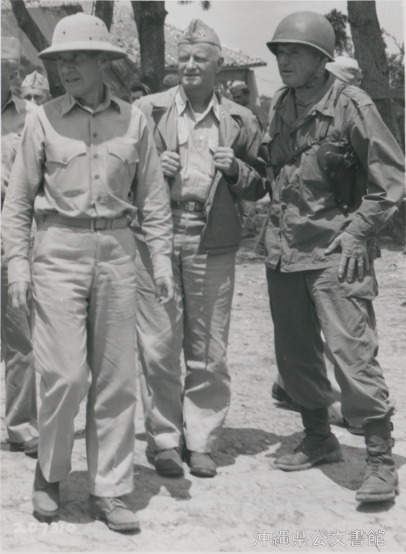| 25 | | | 分 類 名: | 米国陸軍通信隊 沖縄関係 | | 撮 影 地: | 沖縄 | | 撮 影 日: | 1945年4月22日 | | アルバム名: | 米陸軍通信隊写真 13 | | 写真解説: | 【原文】Brig. Gen. Simon Bolivar Buckner, right, Fleet Admiral Chester W. Nimitz and Lt. Gen. Alexander A. Vandegrift, wearning tropical helmet, at an airfield on Okinawa, before a tour of inspection to U.S. Tenth Army Hqs. and 24th Corps Hqs. / 【和訳】沖縄の飛行場にて、第10陸軍総司令部と第24軍司令部視察前のサイモン・ボリバー・バックナー准将(右)、チェスター・ニミッツ海軍元帥、アレクサンダー・ヴァンデグリフト中将(トロピカル・ヘルメット着用)。 | |