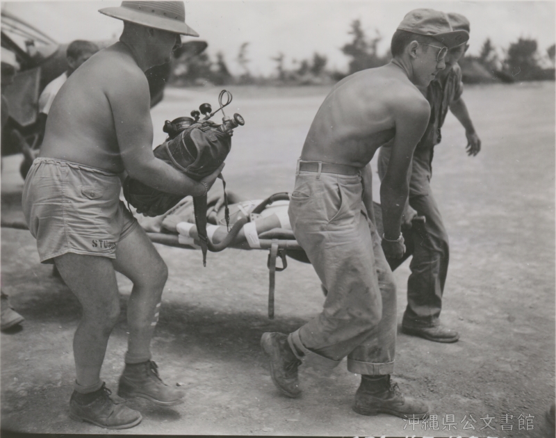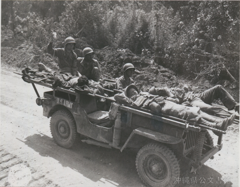 | 26 | | | 分 類 名: | 米国陸軍通信隊 沖縄関係 | | 撮 影 地: | 沖縄 | | 撮 影 日: | 1945年4月22日 | | アルバム名: | 米陸軍通信隊写真 13 | | 写真解説: | 【原文】As an ambulance jeep evacuates three wounded U.S. soldiers to a rear area field hospital, one of them is given blood plasma en route, by corpsmen of 102nd Med. Bn. / 【和訳】負傷した3人の米兵を後方の野戦病院に避難させる救急搬送のジープ。搬送中、そのうちの1人に血しょうを投与する第102医療大隊隊員。 | |