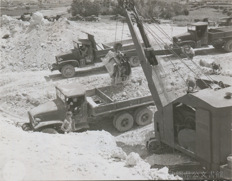 | 27 | | | 分 類 名: | 米国陸軍通信隊 沖縄関係 | | 撮 影 地: | 沖縄 | | 撮 影 日: | 1945年4月22日 | | アルバム名: | 米陸軍通信隊写真 13 | | 写真解説: | 【原文】Most of the hills on Okinawa are of coral formation and provide an excellent surface for roads and airstrips. Here a power shovel is excavating coral to be used in the construction of roads. / 【和訳】沖縄の丘陵地のほとんどがサンゴで出来ており、道路や滑走路に最適である。道路の建設に使うサンゴをパワーショベルで掘る様子。 | |