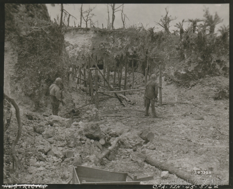 | 51 | | | 分 類 名: | 米国陸軍通信隊 沖縄関係 | | 撮 影 地: | 沖縄 | | 撮 影 日: | 1945年6月10日 | | アルバム名: | 米陸軍通信隊写真 13 | | 写真解説: | 【原文】Three caves of varying construction built by the Japanese were found by a patrol of the 305th Reg., 2nd Bn. a soldier stands in the entrance of the cave to show comparative size. / 【和訳】第2第大隊第305連隊の捜索で日本軍による様々な造りの洞窟が3つ発見された。洞窟の入り口に立つ兵士から大きさが分かる。 | |