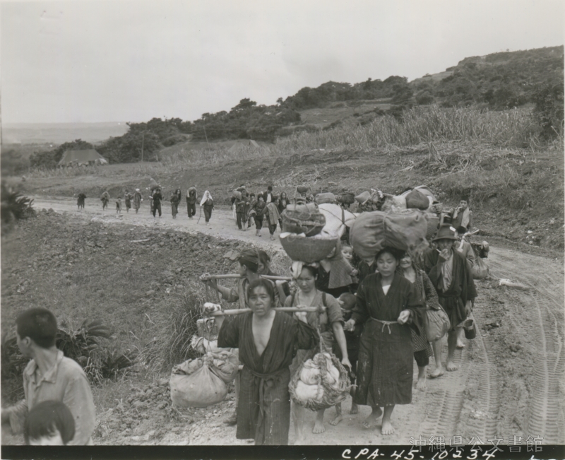 | 67 | | | 分 類 名: | 米国陸軍通信隊 沖縄関係 | | 撮 影 地: | 沖縄 | | 撮 影 日: | 1945年6月20日 | | アルバム名: | 米陸軍通信隊写真 13 | | 写真解説: | 【原文】Okinawan civilians trudge along a road to the area designated by the military government. Many carry their possessions in the traditional manner atop their heads. / 【和訳】軍政府が指定した地域へと重い足取りで歩く沖縄の市民たち。多くの人が頭の上に乗せる伝統的な方法で持ち物を運ぶ。 | |