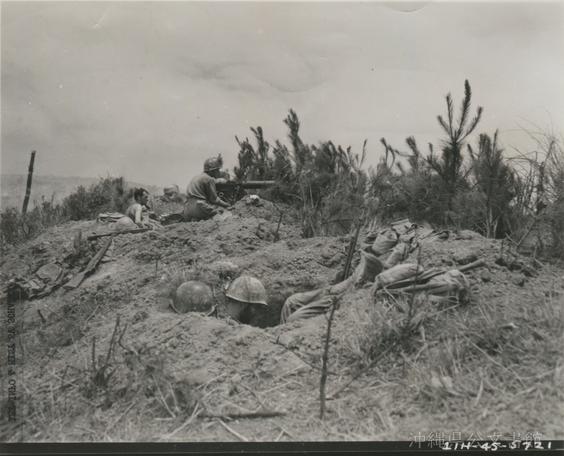 | 56 | | | 分 類 名: | 米国陸軍通信隊 沖縄関係 | | 撮 影 地: | 八重瀬 | | 撮 影 日: | 1945年6月14日 | | アルバム名: | 米陸軍通信隊写真 13 | | 写真解説: | 【原文】Men of the 381st Inf, 96th Div, fire captured Jap 31 cal heavy machine gun back at the enemy on Big Apple Ridge. L to R: Sgt William Turner, Westwood, N.J., S/Sgt James W Smith, Quincy, Mo., and Pfc Glen Wiswell, Hot Springs, S.D. / 【和訳】ビッグ・アップル・リッジ[八重瀬岳]で占領した日本軍の31口径重機関銃を撃つ第96師団第381歩兵隊。左から、ウィリアム・ターナー3等軍曹(ニュージャージー州ウエストウッド出身)、ジェームス・W・スミス2等軍曹(モンタナ州クインシー出身 )、グレン・ウィズウェル1等兵(サウスダコタ州ホットスプリングス出身)。 | |
