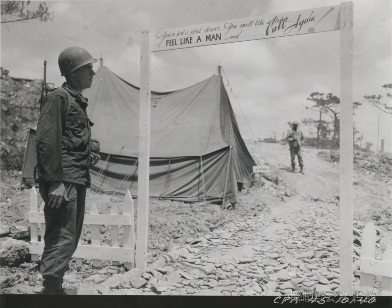 | 59 | | | 分 類 名: | 米国陸軍通信隊 沖縄関係 | | 撮 影 地: | 沖縄 | | 撮 影 日: | 1945年6月16日 | | アルバム名: | 米陸軍通信隊写真 13 | | 写真解説: | 【原文】Pfc Cecil O Toler, Route 2, Anna, Ill., stops at the entrance of the 868th QM fumigation & bath Co. area, on his way out, to read the "welcome back" sign. / 【和訳】第868補給部隊燻蒸消毒・入浴エリアの入り口で「おかえりなさい」のサインを読むセシル・O・トーラー1等兵(イリノイ州アンナ、ルート2 )。 | |