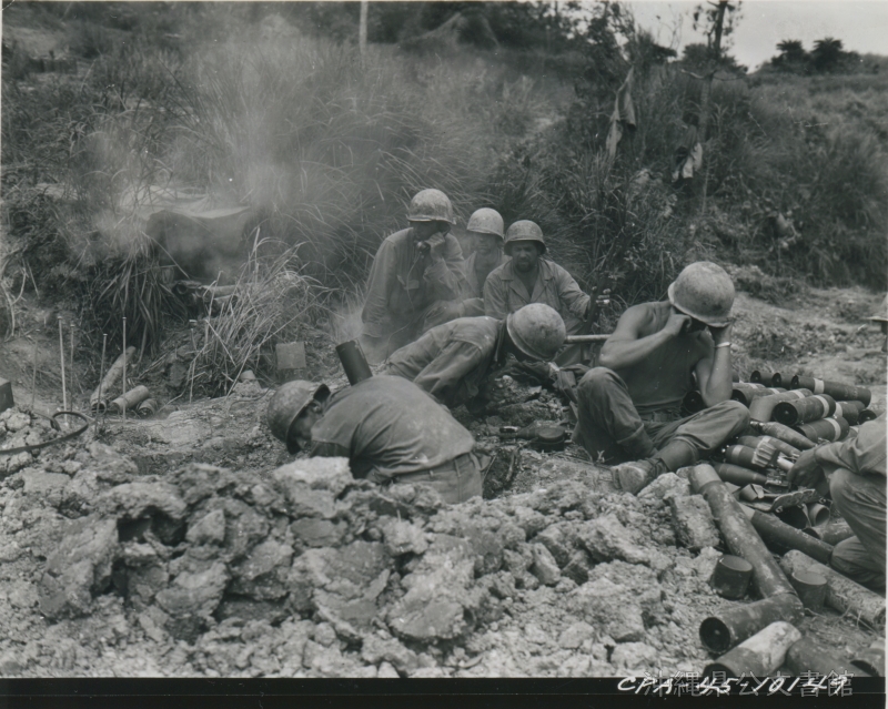 | 55 | | | 分 類 名: | 米国陸軍通信隊 沖縄関係 | | 撮 影 地: | 沖縄 | | 撮 影 日: | 1945年6月14日 | | アルバム名: | 米陸軍通信隊写真 13 | | 写真解説: | 【原文】81mm mortar team of co "M" 383rd Inf firing as observer (seen in background) receives results of firing from CP over field telephone. / 【和訳】指令所から砲撃の結果を電話で受ける第383歩兵M部隊81mm迫撃砲チーム。 | |