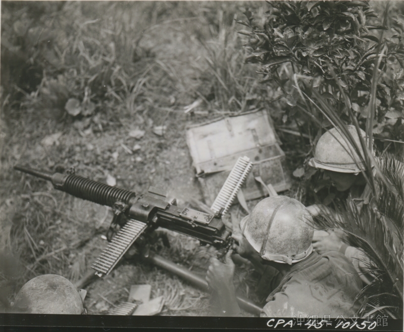 | 53 | | | 分 類 名: | 米国陸軍通信隊 沖縄関係 | | 撮 影 地: | 沖縄 | | 撮 影 日: | 1945年6月12日 | | アルバム名: | 米陸軍通信隊写真 13 | | 写真解説: | 【原文】Machine guns set up at the front lines by Co., 17th Inf, 7th Division. / 【和訳】前線でマシンガンの配置につく第7師団第17歩兵中隊。 | |