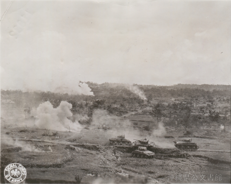 | 71 | | | 分 類 名: | 米国陸軍通信隊 沖縄関係 | | 撮 影 地: | 沖縄 | | 撮 影 日: | 1945年6月21日 | | アルバム名: | 米陸軍通信隊写真 13 | | 写真解説: | 【原文】Fighting goes on bitterly even after organized resistance on Okinawa ceases June 21, as four tanks of the Army's 77th Infantry Division attempt to wipe out a Japanese stronghold on the island. The Tenth Army tank in the center has been knocked out but its three companions protect it and pour fire into the enemy. Shell bursts mark the enemy positions as they desperately attempt to stave off surrender or death. / 【和訳】陸軍第77歩兵師団の4台の戦車が日本軍の拠点を一掃しようと、沖縄での組織的な抵抗がやんだ6月21日の後にも戦いは続いていた。中央の第10陸軍戦車は倒されたが、仲間の3台がそれを守り、敵を砲撃する。敵の陣地では砲弾が炸裂し、降伏あるいは死を必死に食い止めようと必死だった。 | |