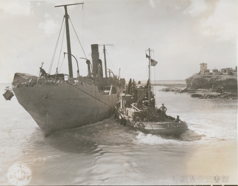 | 98 | | | 分 類 名: | 米国陸軍通信隊 沖縄関係 | | 撮 影 地: | 沖縄 | | 撮 影 日: | 1945年6月30日 | | アルバム名: | 米陸軍通信隊写真 13 | | 写真解説: | 【原文】Salvaged Jap ship shown aground with YTL-454 tug in foreground. Approximately 4000 tons, 290 FT long, 25 FT beam, and 15 FT draft, this ship loaded mostly with medical supplies for the treatment of venereal disease was sunk by our air action and badly burned. LT Richard Crewse was in charge of salvage operations. / 【和訳】YTL-454タグボートを前に座礁する、回収された日本の船。約4000トン、長さ290フィート、船梁25フィート、喫水15フィートのこの船は、主に性病治療のための医療物資を積んでいたが、米軍の空からの攻撃で沈み、大火災となった。 リチャード・クルーゼ大尉が引き揚げ作業を担当した。 | |