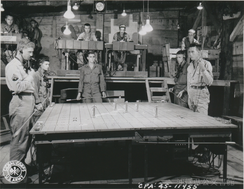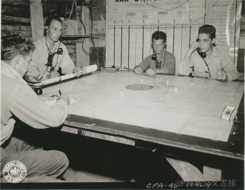 | 96 | | | 分 類 名: | 米国陸軍通信隊 沖縄関係 | | 撮 影 地: | 沖縄 | | 撮 影 日: | 1945年6月2日 | | アルバム名: | 米陸軍通信隊写真 13 | | 写真解説: | 【原文】AAOR 97 AAA group. Foreground, operations board with status board in background. / 【和訳】 第53沿岸高射砲兵旅団運用室。手前は作戦ボード、後ろはステータスボード。 | |