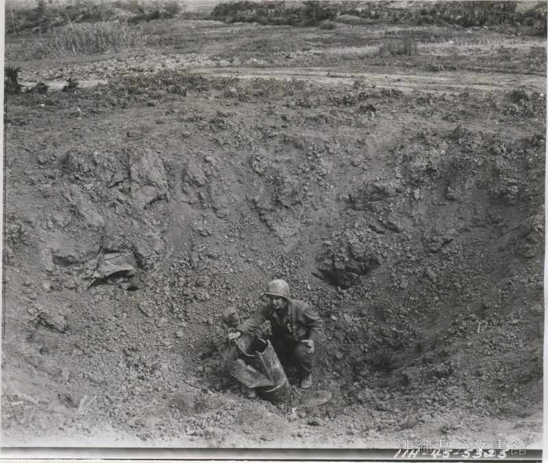 | 35 | | | 分 類 名: | 米国陸軍通信隊 沖縄関係 | | 撮 影 地: | 沖縄 | | 撮 影 日: | 1945年5月10日 | | アルバム名: | 米陸軍通信隊写真 13 | | 写真解説: | 【原文】While men of Hq Co of the 88th Chemical Mortar Bn were digging their fox holes, a 600-pound Jap spigot mortar bomb landed about 90 feet from them. Shown in this photo is the crater left by the bomb, as well as the tail fins of the bomb. Standing beside the crater is Cpl Peter Pardekas, 8 Putnam Rd., Ipswich, Mass. / 【和訳】第88化学砲大隊司令部の兵士が塹壕を掘っていた時に、日本軍の600ポンド迫撃砲弾が約90フィートのところに着弾した。写真は爆弾が残したクレーターと爆弾の尾翼の部分。横に立つのは、ピーター・パルデカス伍長(マサチューセッツ州イプスウィッチ、パットナム通り8番地)。 | |