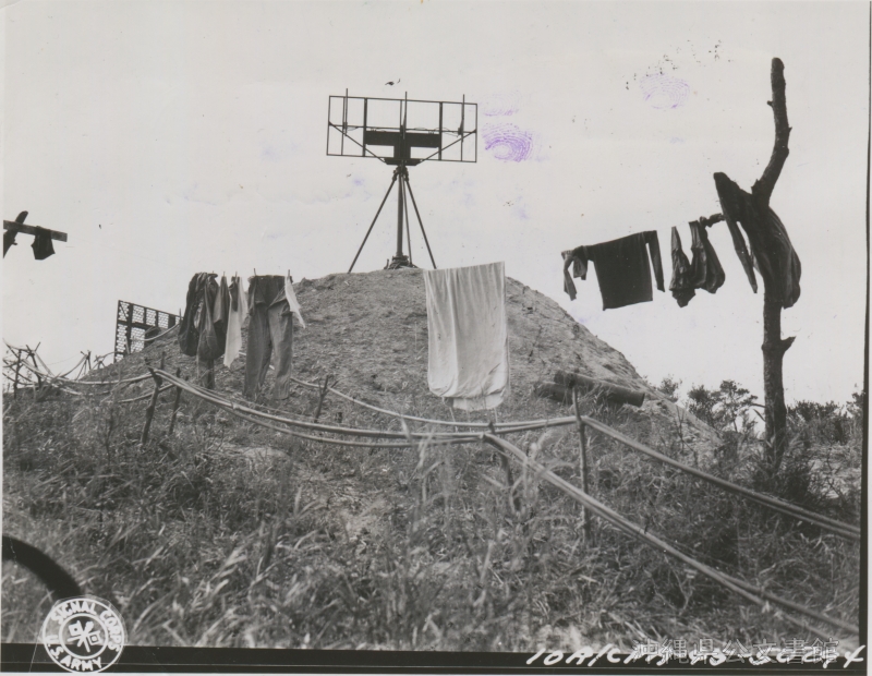 | 19 | | | 分 類 名: | 米国陸軍通信隊 沖縄関係 | | 撮 影 地: | 沖縄 | | 撮 影 日: | 1945年4月1日 | | アルバム名: | 米陸軍通信隊写真 13 | | 写真解説: | 【原文】Burial vaults crested with huge horseshoe depressions above the entrance were used in some instances by the Japs as pillboxes. / 【和訳】入り口の上に巨大な馬蹄形の窪みがあるアーチ形天井を持つ墓は、日本兵によってトーチカとして使用された例もある。 | |