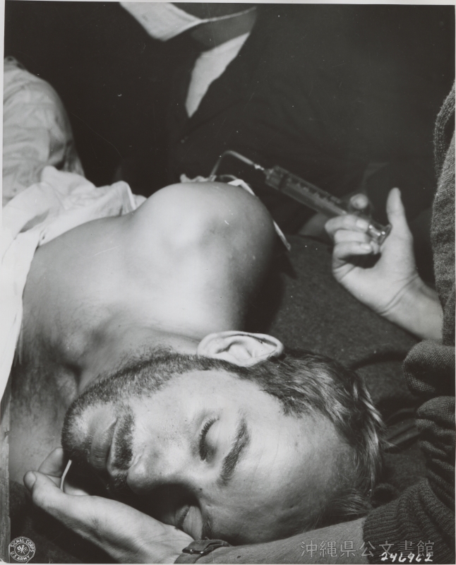 | 42 | | | 分 類 名: | 米国陸軍通信隊 沖縄関係 | | 撮 影 地: | 沖縄 | | 撮 影 日: | 1945年5月1日 | | アルバム名: | 米陸軍通信隊写真 13 | | 写真解説: | 【原文】This battle casualty is given an hypodermic injection during an emergency operation in the surgical tent of the 52nd Portable Surgical Hospital, 7th Medical Bn., 7th Inf. Div. Okinawa. / 【和訳】第7歩兵師団第7医療大隊第52移動外科病院の手術用テントで、緊急手術中に皮下注射を打たれる負傷者。沖縄。 | |