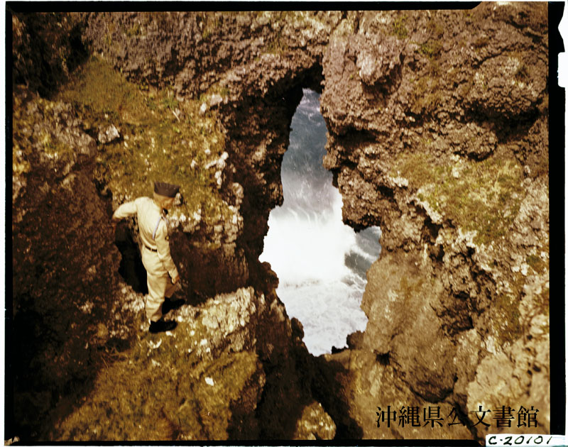 【和訳】 ローランド R ソロモン偵察隊運転手、第2空軍将校、第503軍情報部。フィリピン海(東シナ海)に突き出した断崖にえぐり造られた洞窟のある恩納岬(万座毛)の探検。沖縄旅行中