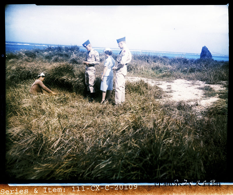 【和訳】 中部沖縄の保養施設ムーン・ビーチの入口の前で(左から)ローランド R.ソロモン、ジャネット J.マーサ、ジ-ン ヴェーンパー