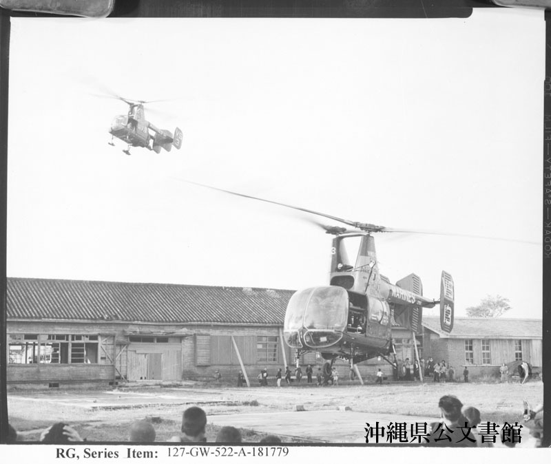 【和訳】 名護病院から陸軍病院へ負傷した海兵隊員の輸送を含めた作戦展開中に、名護病院近くの学校の校庭に近づく第2米海兵隊観測飛行隊シベリ少尉
