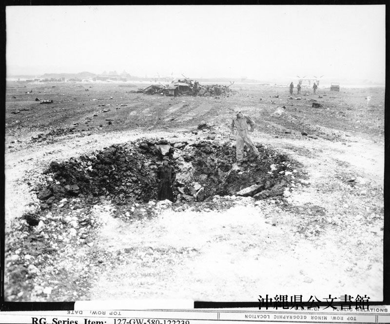 【和訳】 ほとんど毎晩日本軍機が読谷飛行場周辺に爆弾を落とし、翌朝にはこのくらい大きい穴ができていることもある