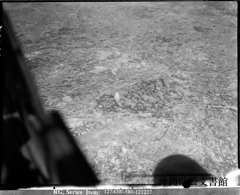 【和訳】 白い煙は沖縄本島南部の日本軍陣地の近くで155mm榴弾砲や105mm榴弾砲が爆発したことを示している。航空写真は第3水陸両用軍団のパイパー小型機から撮影