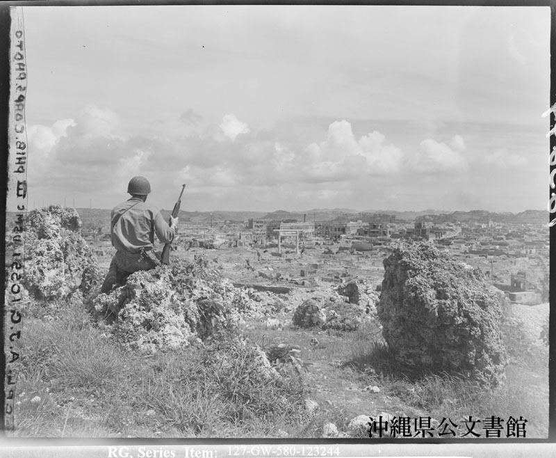 【和訳】 廃墟と化した那覇の街を見渡す第6海兵師団の海兵隊員