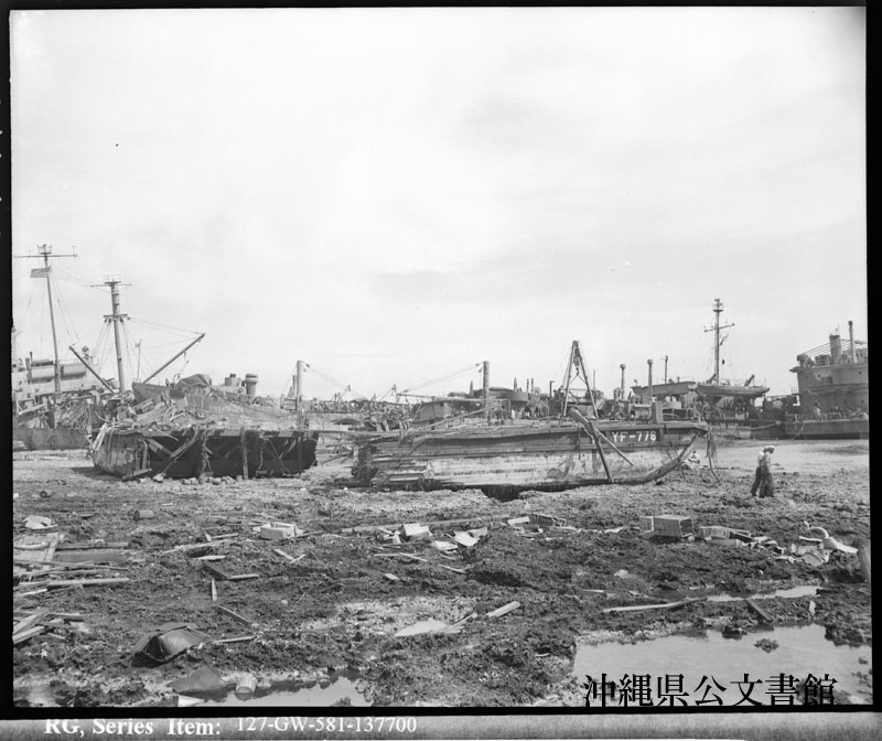 【和訳】 中城湾の陸に打ち上げられた艀。台風で半壊