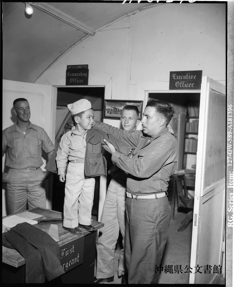 【和訳】 ハンブリック三等軍曹に軍服を着せてもらうヒロシ君。孤児であるヒロシ君は第3海兵師団第12連隊第4大隊K砲兵中隊に属し、カーキの軍服に作業着も一式持っている。中央はホーン一等兵