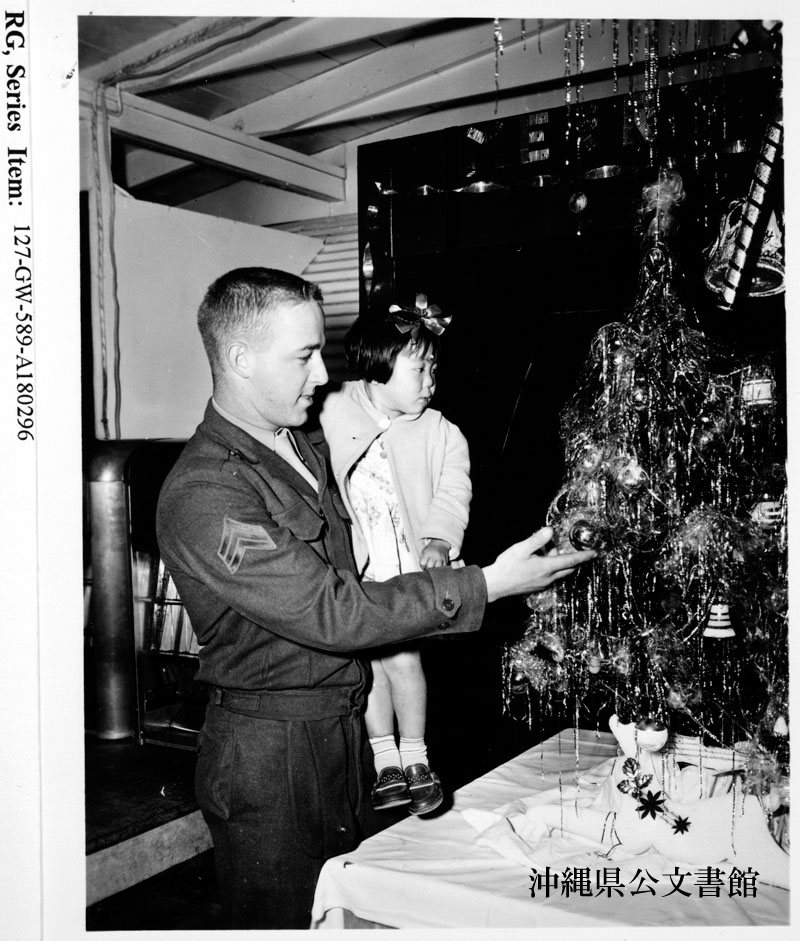 【和訳】 沖縄の子供たちのためにクリスマスパーティーを開く第1水陸両用トラクター大隊の海兵隊員。ホワイト・ビーチ地区にて