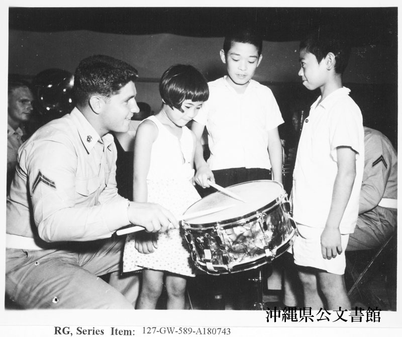 【和訳】 第3海兵師団楽隊のコンサートのあとマッケイブ伍長から直接ドラムの指導を受ける名護の三人の子供たち。楽隊は現在沖縄ツアー中