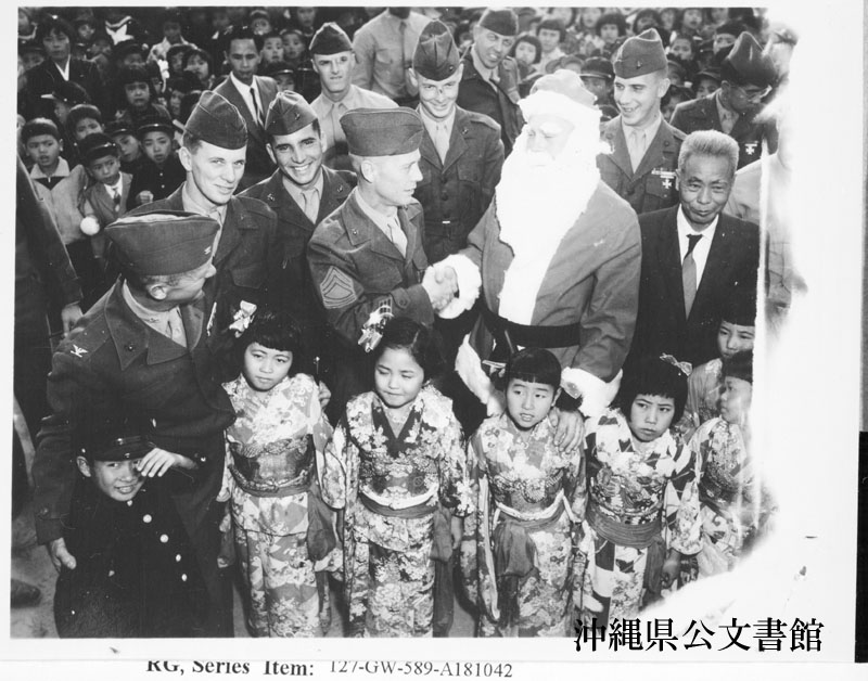 【和訳】 クリスマスパーティーを盛り上げてくれたサンタクロースに礼を言うアンダーソン曹長。このパーティーには500人を超える沖縄の学童が招かれた