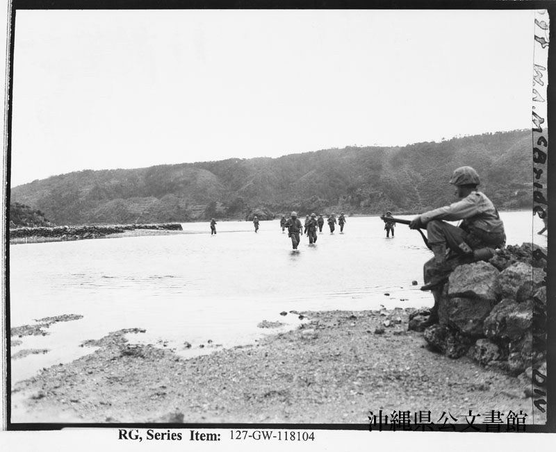 【和訳】 モトムラ半島[本部半島か?]で、浅瀬を歩いて渡る米軍部隊