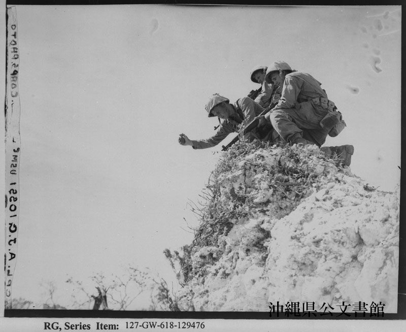【和訳】 洞窟を掃討する3人の海兵隊員——日本兵が潜んでいるとの報告を受け、洞窟に掃討をかける海兵隊の3兵士