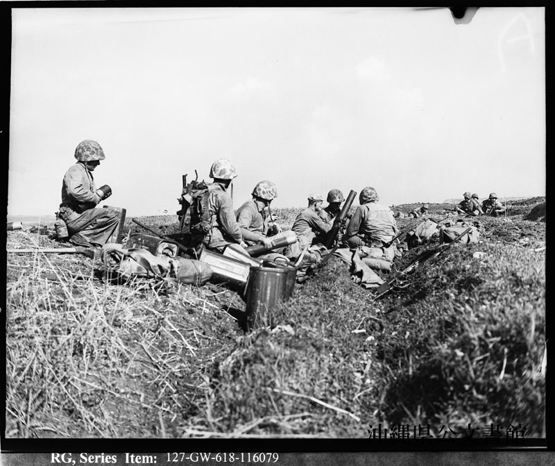 【和訳】 上陸後直ちに海岸を出発し、ほどなくして迫撃砲座を構築している海兵隊員。さしたる抵抗もなく内陸部への進軍は迅速で、敵を目指して進む先遣隊を掩護するとともに、攻防戦に備えて重火器を据え付けている