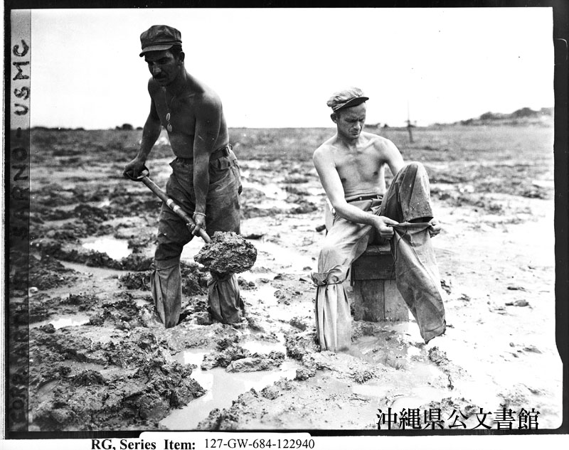 【和訳】 泥でお困り?バーバー2等兵(ミズーリ州出身)とジョンソン1等兵(イリノイ州出身)は、砂袋を履くことが手軽な泥対策になると思いついた。