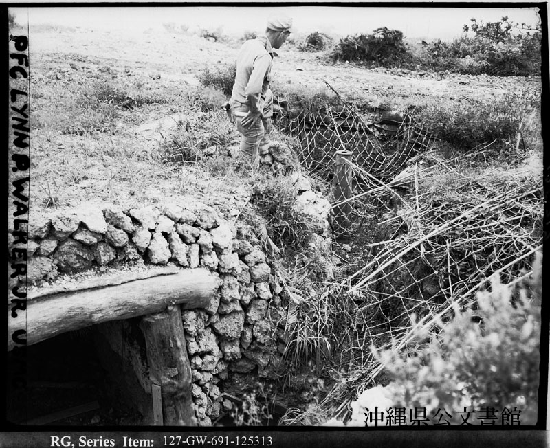 【和訳】 小禄半島--小禄半島屋良座の西側にある日本軍の防備の一端。写真からは日本軍の地下壕や塹壕の構造がわかる。