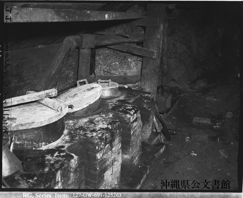 【和訳】 小禄半島--小禄半島の先原崎灯台の真南に位置する丘の地下80フィートにある日本軍の調理室。日本兵が置き去りにした精巧なレンガのかまどや鍋に注目。日本軍が地下の“都市”で快適に暮らしていたことや、その暮らしを長く維持するつもりだったことがうかがえる。
