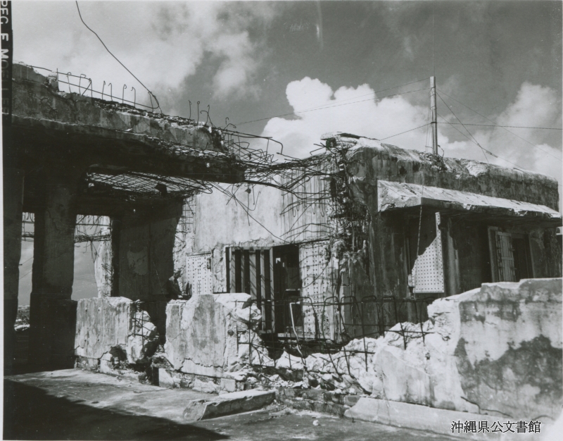 【和訳】 ペリリューの日本軍司令部の 爆破された遺構は、我々の海軍砲撃の正確さを物語っている。左側の建物の部分は海軍の営倉として使用されており、海兵隊分遣隊によって運営されている。