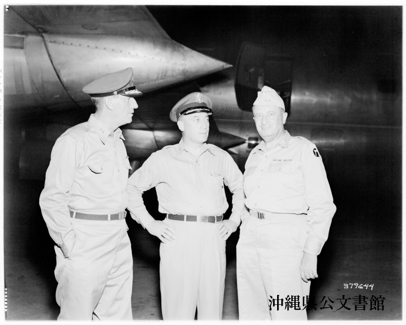 【和訳】 極東における空軍基地を視察中に沖縄を訪れた第14空軍司令官オドニール少将。写真はオドニール少将(中央)と出迎えに来た第20空軍司令官スターリー少将(左)と琉球軍司令官ビートラー少将(右)。