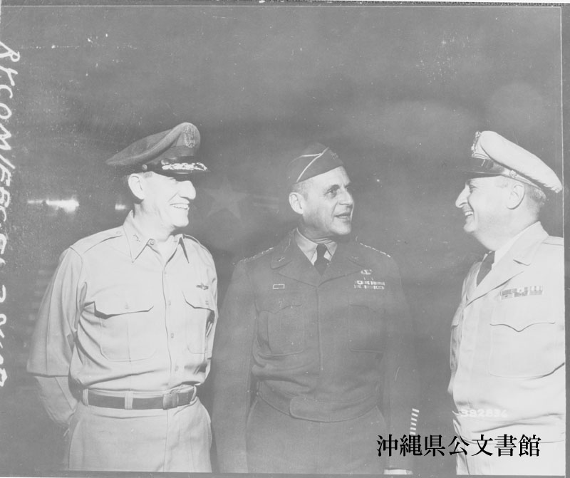 【和訳】 嘉手納基地で第20空軍司令官ステアリー少将(左)と極東軍司令官ビートラー少将(右)の出迎えを受ける国連軍最高司令官兼極東軍最高司令官のリッジウェイ将軍(中央)。リッジウェイ将軍は陸軍参謀長コリンズ将軍を迎え、沖縄滞在後コリンズ将軍と共に日本本土へ行く予定。