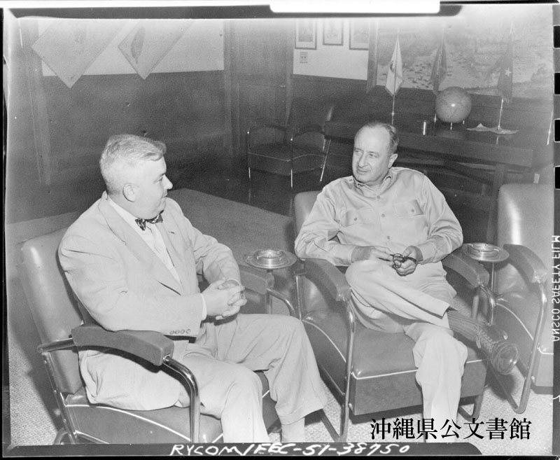 【和訳】 琉球軍司令官ビートラー少将と極東軍陸軍省処理作業監査相談役ホワイトヘッド氏。両氏は共にオハイオ州出身者なので故郷の思い出話に花が咲いた。ホワイトヘッド氏は極東での鉄屑検査を担当している。