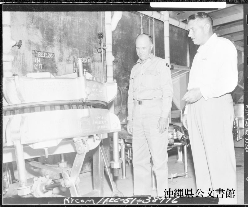 【和訳】 琉球軍副司令官シャーマン准将にタイヤの再生作業に使われる型流しの工程を説明する沖縄タイヤ産業の責任者グラッベ氏(右)。シャーマン准将は島で最も新しい産業の開業を祝って駆けつけた。