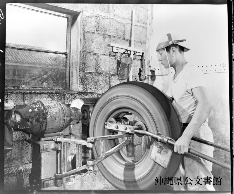 【和訳】 沖縄タイヤ産業にて。タイヤ再生作業の第一工程である研磨機で古いタイヤを剥がす地元労働者。