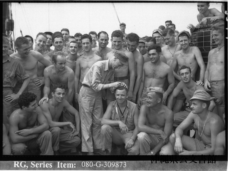 【和訳】 第1師団第5連隊の海兵隊員と水兵にサインをするアーニー・パイル。攻撃輸送艦チャールズ・キャロル(APA-28)上で。沖縄に向かう途中のウルシー環礁にて。
