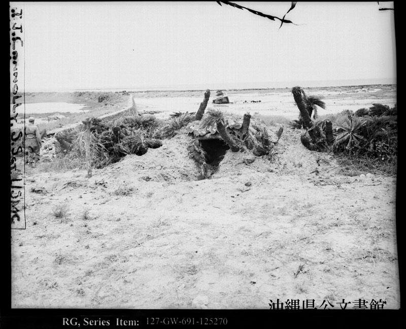 【和訳】 小禄半島--日本軍の掩蔽(えんぺい)壕と小禄半島西海岸沿いの防波堤。第4海兵連隊は6月4日にここから上陸作戦を開始した。