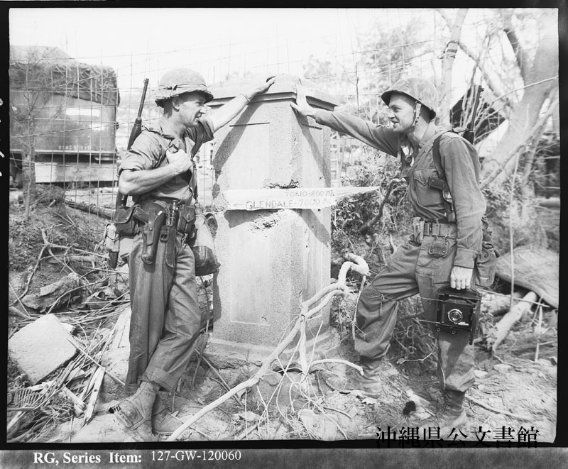 【和訳】 沖縄上陸作戦を撮影中に邂逅したカリフォルニア州グレンダーレ出身の2人の米国海兵隊従軍カメラマン。左は”レッド”マン軍曹、右はウォーカー1等兵。標識は、故郷をはるか遠く離れていることを彼等に思い出させる