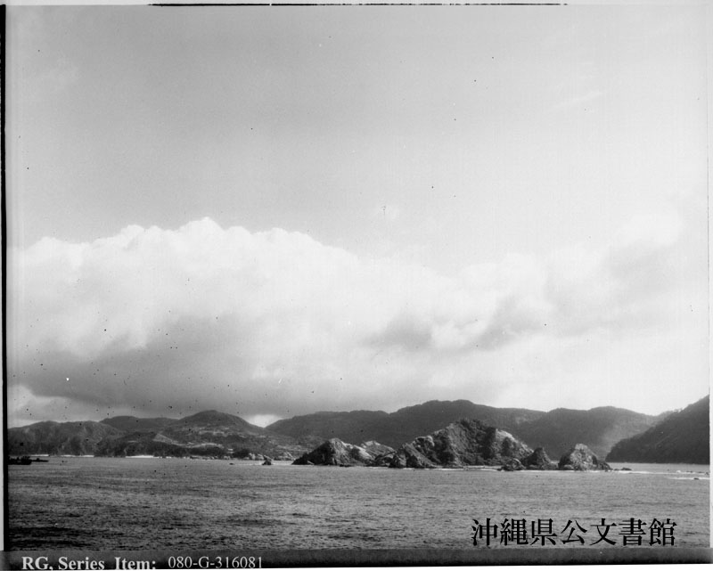 【和訳】 慶良間諸島の渡嘉敷島。米陸軍の部隊は、さしたる抵抗も受けずにこの島に上陸した。そうした上陸作戦の1つ。水上機母艦チャンドラー(AV-10)から撮影。