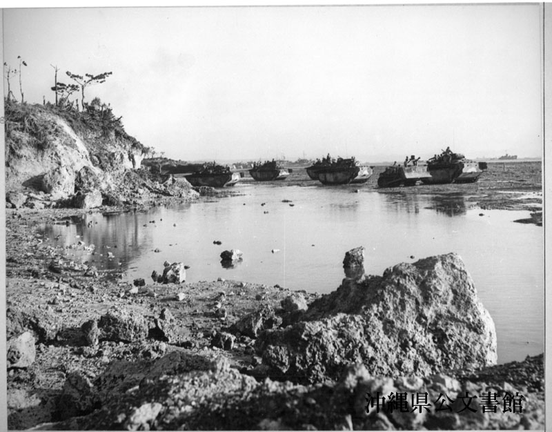 LVT(A)(4) roll across the long shallow beach of Okinawa, skirting the tiny ponds left by the receding tide.